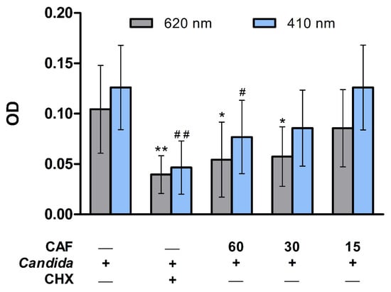 Microdilution test for caffeine (CAF) effects against the growth of C. albicans adherent to the PMMA discs showing the optical density (OD) of different groups measured at 620 nm and 410 nm. Data are expressed as mean ± SD (n = 10) and statistically analyzed using one-way ANOVA followed by Tukey’s post hoc test. The significance was considered when * p ≤ 0.05 and ** p ≤ 0.01 as compared with control at 620 nm or # p ≤ 0.05 and ## p ≤ 0.01 as compared with control at 410 nm.