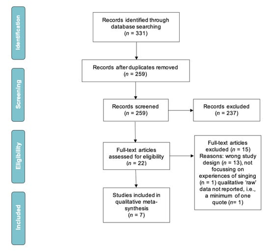 Of 331 articles identified, 72 duplicates were removed, and 237 articles were excluded through title and abstract screening (Figure 1). The full text was reviewed for 22 articles, with 15 excluded as they did not meet eligibility criteria. Seven articles were included in the final sample. No additional studies were identified by hand searching of reference lists from the included studies.
