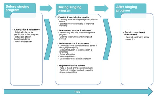 Key findings indicate broad international consistency regarding the essential elements of singing for lung health programs that underpin the evolutionary nature of participants’ experiences and engagement. The meta-synthesis of themes revealed that responses to the program voiced by participants evolved over time, from initial anxiety and hesitation prior to the program beginning, through to perceived changes in physical abilities, social engagement and establishment of new routines during the program. As the intervention progressed, participants’ anxiety gradually declined as they were presented with new opportunities to learn and apply new skills related to singing, to breathing control, and to situations beyond the program. Participants’ anticipation and reluctance transformed into an enhanced sense of self-esteem and boosted confidence, which in turn allowed them to expand their social connections. A sense of eagerness to maintain these benefits most particularly those centered on social connectedness was expressed by participants at the program conclusion. The temporal nature of the changes in relation to the conduct of the singing program forms the map against which these changes became evident (Figure 2 and Table 3).