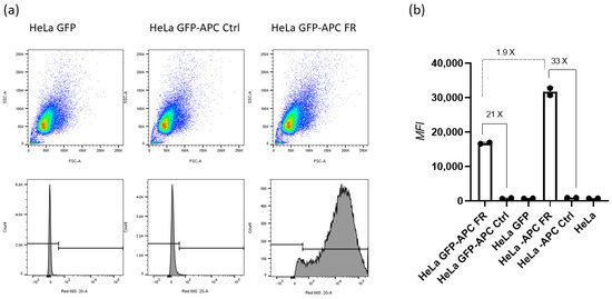 Relative expression levels of cell-surface folate-binding proteins (receptor) in HeLa and HeLa GFP cells expressing green fluorescent protein (GFP). (a) determined by flow cytometry; (b) median fluorescence intensity; APC FR represents allophycocyanin-labeled antibody against anti-human Folate Receptors alpha and beta, while APC Ctrl represents a allophycocyanin labeled Rat IgG2a, Ctrl antibody (kappa isotype).