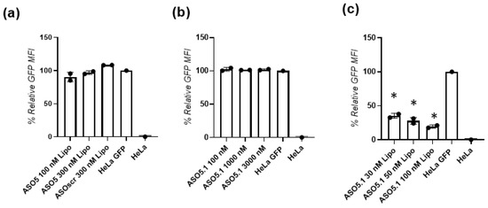 Relative GFP fluorescence in GFP-expressing HeLa cells. Transfection was performed (a,c) with lipofectamine (Lipo) or (b) without. GFP expression was assessed measuring the median fluorescence intensity (MFI) 48 h post transfection with the ASOs by flow cytometry. Error bars indicate standard deviation (SD) of at least two independent biological replicates. * p < 0.05 versus HeLa GFP calculated by one-way ANOVA.
