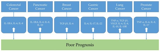 In this review, representative inflammatory cytokines in colorectal, pancreatic, breast, gastric, lung, and prostate cancers were discussed. From the preclinical studies using cancer cell lines and cancer-induced animal models, some potential treatment strategies targeting inflammatory cytokines were suggested (Table 1). In addition, from the clinical trials, the associations between inflammatory cytokines and cancer prognosis were evaluated (Table 2 and Figure 1). Taken all together, by understanding the biological roles of inflammatory cytokines toward the cancers, we may modulate the inflammatory tumor microenvironment to find ideal cancer-targeted treatment.