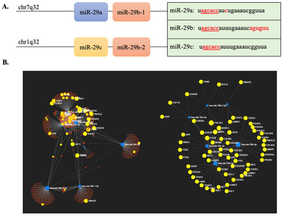 The miR-29 family members and their potential targets. (A) Mature sequences and chromosomal locations of miR-29s. MiR-29a/miR-29b-1 cluster is located in chr7q32, whereas miR-29b-2/miR-29c is in chr1q32. The mature miR-29s share a common seed region (agcacc) but are different at the cytosine position in miR-29a and a nucleotide sequence at the end of miR-29b (aguguu) which is known for nuclear localization. (B) The potential targets of miR-29s. The visualization is based on miR-29s’ experimental targets of the miRNet platform (https://www.mirnet.ca, accessed on 24 July 2022). Each dot represents a gene. The yellow dots indicate the target genes involved in cancer pathways.