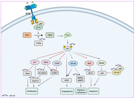 Potential functions of miR-29s in PI3K/AKT signaling pathways. MiR-29s directly inhibit the transcription of various PI3K/AKT downstream factors, resulting in the suppression of cell proliferation, angiogenesis, cell migration, and metastasis, while causing induction of cancer cell apoptosis.