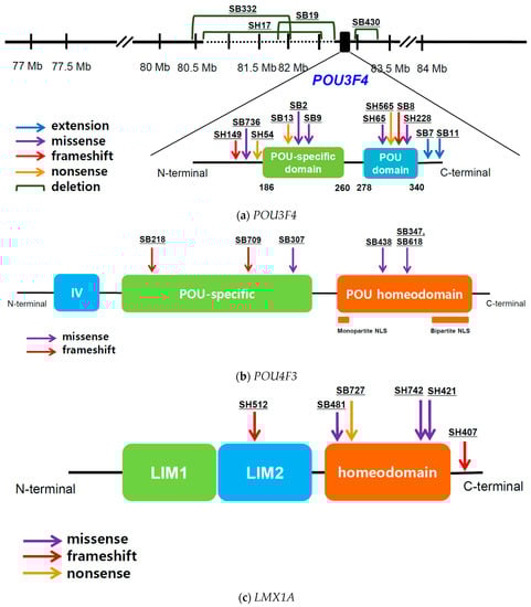 - Lin, Y.H.; Lin, Y.H.; Lu, Y.C.; Liu, T.C.; Chen, C.Y.; Hsu, C.J.; Chen, P.L.; Wu, C.C. A novel missense variant in the nuclear localization signal of POU4F3 causes autosomal dominant non-syndromic hearing loss. Sci. Rep. 2017, 7, 7551. [Google Scholar] [CrossRef] [PubMed]