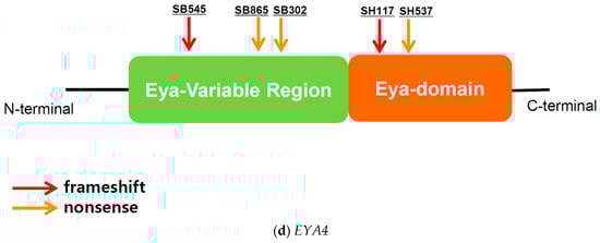 - Choi, H.S.; Kim, A.R.; Kim, S.H.; Choi, B.Y. Identification of a novel truncation mutation of EYA4 in moderate degree hearing loss by targeted exome sequencing. Eur. Arch. Otorhinolaryngol. 2016, 273, 1123–1129. [Google Scholar] [CrossRef]