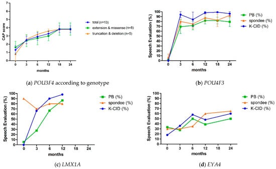 Postoperative cochlear implant outcomes in patients with mutations in transcription factor genes: (a) POU3F4 according to genotype; (b) POU4F3; (c) LMX1A; (d) EYA4.