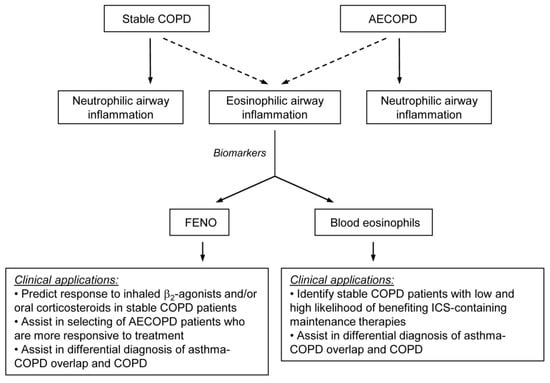 Nonetheless, such a distinction has yet to be implemented in everyday clinical practice, where, in most cases, neither sputum induction nor its processing and evaluation are feasible. In this review, we will focus on two established biomarkers, fractional exhaled nitric oxide (FENO) levels [,] and peripheral blood eosinophil count [,], and summarize the current evidence on how these measures can be used to provide sensitive and specific estimates of airway eosinophilia in patients with stable COPD and AECOPD.