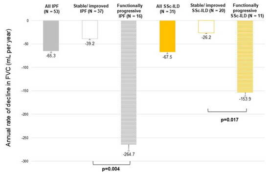 The annual median decline in FVC for the functionally progressive SSc-ILD subgroup was −153.9 (−278.3 to −121.4) mL/year, which was significantly higher compared to −26.2 (−75.4 to −1.6) mL/year in the stable/improved SSc-ILD subgroup (p = 0.017). In the functionally progressive IPF and stable/improved IPF subgroups, the respective data were −264.7 (−404.9 to −204.6) vs. −39.2 (−85.7 to +7.5) mL/year (p = 0.004). FVC decline for all patients, including functionally stable/improved and functionally progressive subgroups regarding IPF and SSc-ILD, are presented in Figure 2.