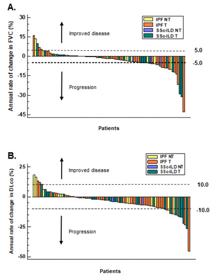Annual changes in FVC (A) and DLCO (B) % of the predicted value in all IPF and SSc-ILD patients according to specific treatment groups. DLCO, diffusing capacity for carbon monoxide; FVC, forced vital capacity; IPF, idiopathic pulmonary fibrosis; NT, no treatment; SSc-ILD, systemic-sclerosis-associated interstitial lung disease; T, treatment.