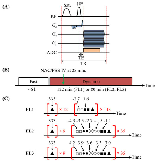 - Khlebnikov, V.; Geades, N.; Klomp, D.W.J.; Hoogduin, H.; Gowland, P.; Mougin, O. Comparison of pulsed three-dimensional CEST acquisition schemes at 7 tesla: Steady state versus pseudosteady state. Magn. Reson. Med. 2017, 77, 2280–2287. [Google Scholar] [CrossRef]