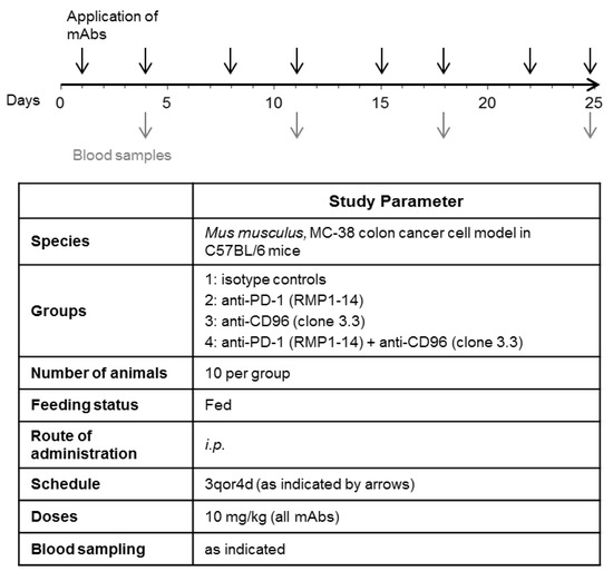 In order to establish the MC-38 tumor model, C57BL/6NTac mice were transplanted with 1 × 105 of MC-38 colon carcinoma cells subcutaneously into the right flank of the mice at day 0. The animals were dispatched randomly by a computer program into the different groups. Application of mAbs was initiated on day 3 after tumor grafting (see Figure 1). The following antibodies were used: anti-CD96 (BioLegend, San Diego, CA, USA, Cat. No. 131704), anti-PD-1 (BioXCell, Lebanon, NH, USA, Cat. No. BE0146) and isotype control antibodies (Rat IgG2a, BioXCell, Lebanon, NH, USA, Cat. No. BE0089 and Rat IgG1 BioXCell, Lebanon, NH, USA, Cat. No. BE0088). The antibodies were diluted in PBS and injected intraperitoneally with a volume of 10 mL/kg per mouse, twice weekly.
