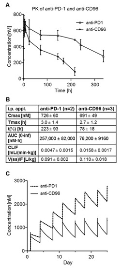 Doses of 10 mg/kg of mAbs anti-CD96 (Clone 3.3, Biolegend, San Diego, CA, USA, Cat. No. 131704) or anti-PD-1 (Clone RMP1-14, BioXCell, Lebanon, NH, USA, Cat. No. BE0146) were applied intraperitoneally into C57/BL6NTac mice. Blood samples were drawn before application and after 0.5, 1, 2, 4, 8, 24, 72, 144, 216, 240 and 336 h for anti-PD-1, and after 1, 2, 4, 8, 24, 72, 144, 168 and 216 h for anti-CD96. Pharmacokinetic (PK) parameters were calculated by means of non-compartmental analysis with ToxKin 3.3 software. The expected concentration-time profiles of anti-PD-1 and anti-CD96 mAbs in the tumor therapy study were simulated using Phoenix WinNonLin 6.4.