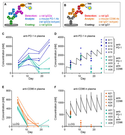 Exposure measurement of tumor therapy study. (A,B) ELISA setup against anti-PD-1 and anti-CD96. (C,E) Plasma concentrations of anti-PD-1 and anti-CD96 were determined for 5 animals per group and plotted against time. Samples below LLOQ are plotted on the x-axis. (D,F) Simulated concentration–time curves (black lines, see Figure 2C) are compared with the measured data for anti-PD-1 and anti-CD96, respectively. Treatment groups are shown on the right. Plasma samples for animals 11, 13, 21–25 and 32 at day 25 are missing because these animals were sacrificed due to high tumor load.