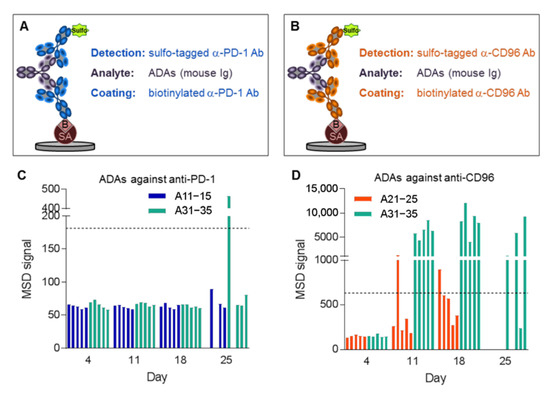 We hypothesized that ADAs were responsible for the observed low mAb concentrations. Therefore, bridging assays on the MSD platform were developed for detecting ADAs against anti-PD-1 and anti-CD96 (Figure 5A,B), respectively. For this purpose, the mAbs were labeled with either biotin or sulfo-tag, leading to a positive MSD signal when ADAs are present in a sample. This assay enabled us to measure ADAs in the plasma samples of the MC-38 mice, using only two microliters of plasma. Plasma samples were considered positive for ADAs if their signal was increased by more than three times above background. It is important to note that the sensitivity of the ADA assays may be too low to detect small amounts of high-affinity ADAs, or even higher amounts of low-affinity ADAs present at the beginning of the immunogenic reaction. For background measurement, plasma samples of untreated mice were used. Figure 5D shows that many animals had ADAs against anti-CD96 beginning at day 11, especially those treated with both mAbs. The intensities of the MSD signals were only moderately increased in animals receiving anti-CD96 alone (A21–25), but excessively high in animals that were additionally treated with anti-PD-1 (A31–35). ADAs against anti-PD-1 (Figure 5C) were only detected in one animal (A31) receiving the antibody combination at day 25. Taken together, these data suggest that ADAs were responsible for the detection of low concentrations of the mAbs.