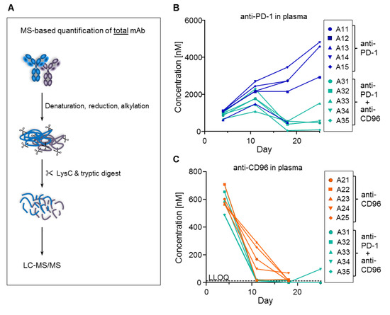 Total concentrations of anti-PD-1 and anti-CD96 measured by MS. (A) MS-based workflow for total mAb quantification. Total plasma concentrations of (B) anti-PD-1 and (C) anti-CD96 (compare with ELISA data from Figure 4). Samples below LLOQ are plotted on the x-axis. Plasma samples for animals 11, 13, 21–25 and 32 at day 25 are missing because these animals were sacrificed due to high tumor load.