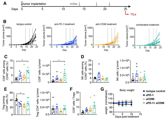 In order to further corroborate the beneficial effect of the anti-CD96/anti-PD-1 combination, we investigated the composition of tumor-infiltrating lymphocytes in MC-38 tumors after 11 days of treatment. This harvest timepoint was chosen as a compromise between detectable mAbs levels and the emergence of ADAs. However, to ensure consistent presence of harvestable tumor material we opted to initiate antibody treatment 14 days after tumor placement, by which time sizeable tumors had formed in every mouse (Figure 8A). Consequently, the therapeutic effect was less pronounced compared to our initial tumor study shown above (Figure 8B). Importantly, we could detect an increase in CD8+ T cells in tumors of mice treated with the dual antibody combination compared to anti-PD-1 or anti-CD96 alone, reaching statistically significant levels compared to isotype control (Figure 8C). In contrast, no statistically significant effects were found on NK cells (Figure 8D). Anti-CD96 treatment could also significantly reduce the frequency of regulatory CD4+ T cells (Treg) compared to control, although this was less pronounced in the combination with anti-PD-1 (Figure 8E). Finally, although not statistically significant, the effector/regulatory ratio CD8+/Treg was favorably shifted by the anti-CD96/anti-PD-1 co-blockade (Figure 8F). Of note, the combination of both antibodies did not result in changes to the animals’ well-being or weights (Figure 8G).