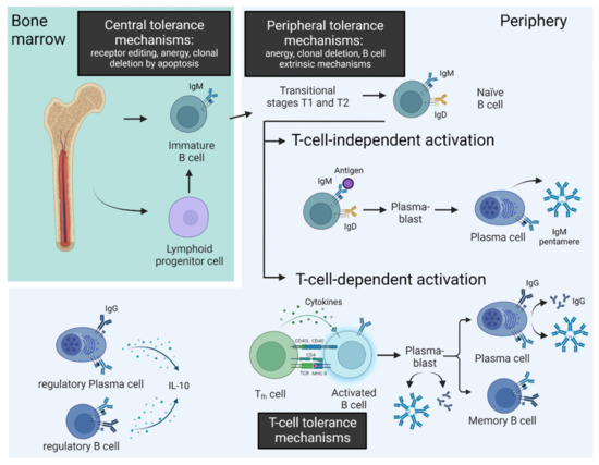 B-2 cell maturation in the bone marrow is characterized by the development of the BCR. Subsequently immature B cells leave the bone marrow. Naïve B cells can undergo T-cell-independent and T-cell-dependent activation. Tolerance mechanisms involving central tolerance mechanisms, peripheral tolerance mechanisms and T-cell tolerance mechanisms are marked in grey. The figure was created with ‘Biorender.com’.