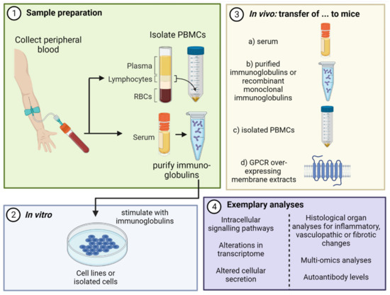 Moreover, several strategies have been established to transfer autoantibody-induced pathologies to animal models and build a platform to further investigate the respective pathomechanisms. These strategies involve the transfer of (a) serum [120], (b) IgG purified from serum [121] and (c) PBMC from diseased patients and healthy donors. A further strategy involves immunization with special agents, e.g., GPCR-overexpressing membrane extracts, (d), leading to the generation of autoantibodies and secondary to pathogenic effects [122,123]. These strategies were also applied to develop animal models of SSc mirroring autoantibody-mediated pathologies.