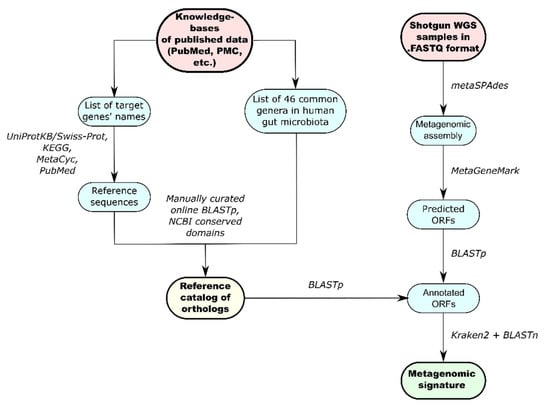 - Kovtun, A.S.; Averina, O.V.; Zakharevich, N.V.; Kasianov, A.S.; Danilenko, V.N. In silico identification of metagenomic signature describing neurometabolic potential of normal human gut microbiota. Russ. J. Gen. 2018, 54, 1101–1110. [Google Scholar] [CrossRef]