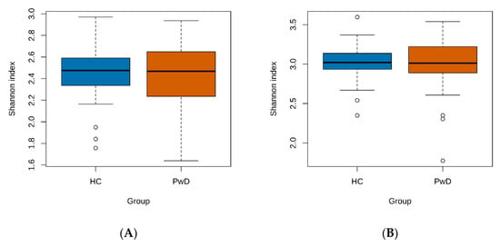 Differences in taxonomic profiles on ‘Phylum’, ‘Genus’, and ‘Species’ levels between the PwD and HC groups were identified using the Mann–Whitney U test with a significance threshold of p < 0.05 and an FDR (false-discovery rate) correction for multiple comparisons using the Benjamini–Hochberg method. Taxa identified in less than half of the samples were excluded from comparative analysis.