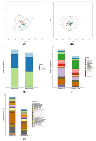 On the other hand, we identified no significant differences at the ‘Phylum’ level. Only Proteobacteria were at relatively higher levels in the PwD metagenomes. However, changes in the relative abundances of Firmicutes, Bacteroidetes, and Proteobacteria phylotypes have been previously shown [67,68,69].