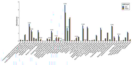 Changes in abundances of the genes in the PwD and HC groups. Only genes identified in more than half of the samples are shown on the graph. The values above the bars indicate the FDR-corrected p-values for genes with statistically significant differences in abundances.