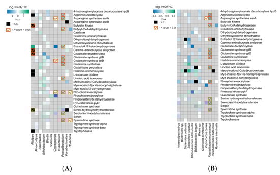 After taxonomic analysis, metagenomic reads for each sample were assembled into contigs. Then, ORFs were predicted and annotated using the updated catalog of homologs. Relative abundances for the putative genes encoding enzymes were counted and compared, as described in the ‘Materials and Methods’ section. The genes encoding enzymes identified in more than half of the analyzed samples are presented in Figure 3, and complete results are listed in Supplementary Table S5. We found a statistically significant decrease in abundances in the PwD group in comparison with the HC group (FDR-corrected p-value < 0.05) for genes involved in the synthesis of arginine (argininosuccinate lyase), asparagine acid (asparagine synthetase asnA), GLU (glutamate synthase subunits gltB and gltD), spermidine (spermidine synthase), and in genes involved in the degradation of 17-beta-estradiol (estradiol 17-beta-dehydrogenase), degradation of serotonin for melatonin production (serotonin N-acetyltransferase), and linoleic acid conjugation (linoleic acid isomerase). Increased abundances with an FDR-corrected p-value < 0.05 were shown for genes encoding catalase, dihydroxyacetone formation (dihydroxyacetone phosphatase), transportation of GABA (gamma-aminobutyrate antiporter), degradation of GLU (glutamate mutase subunits glmE and glmS and methylaspartate ammonia-lyase), and histamine (histidine ammonia-lyase).