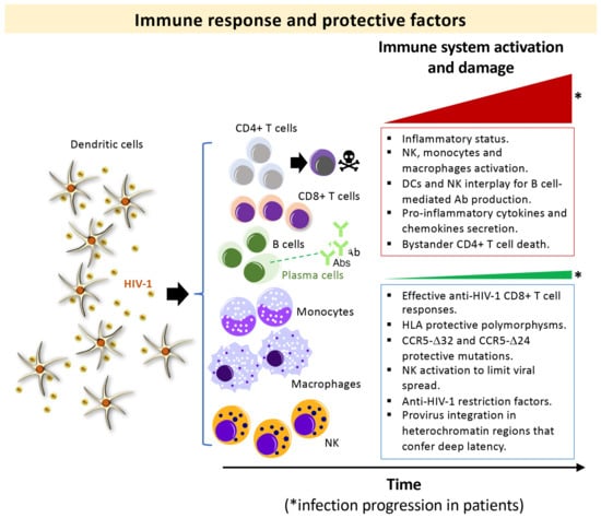 In the absence of antiretroviral therapy (ART), the hallmark of human immunodeficiency virus type 1 (HIV-1) infection is the gradual destruction of the naive and memory CD4+ T-lymphocytes and the associated immunological abnormalities leading to the acquired immunodeficiency syndrome (AIDS) [,,,,,,,,,,] (Figure 1, progressors immune system damage, top box). The severity of the symptoms and viral transmission strongly correlate with the peak of viral load (VL) during primary infection and the subsequent viral set-point [,,,,,,,,,,,,]. HIV-1 infection is characterized by a wide spectrum of disease outcomes according to the progression time of patients. Different nomenclatures have been used to name the distinct groups of HIV-1 individuals (reviewed in []). The typical HIV-1 infected patient, in the absence of ART, progresses to AIDS and death over a period of about 8–10 years after seroconversion [,,]. Some patients, designated rapid progressors (RPs), progress to AIDS within three years of primary infection [,,]. On the other side, there is a small subset of HIV-1 individuals that are able to permanently control viral replication and clinical progression and might never progress or progress very slowly [,] (Figure 1, non-progressors immune system damage, bottom box). In general, these subjects have been infected with HIV-1 for more than ten years, maintaining high CD4+ lymphocyte numbers, undetectable VL, without clinical symptoms, and remaining therapy naïve []. These individuals have been defined as long-term non-progressors (LTNPs) [,,,,], elite controllers (ECs) [,], slow progressors [,,], HIV controllers (HICs) [] and elite suppressors []. Within this set of individuals, some subgroups can be distinguished in terms of VL: viremic LTNPs or viremic controllers (vLTNPs or LTNP-VCs) with VLs between 50 and 2000 copies/mL [], LTNPs viremic non-controllers (LTNP-NCs) with VLs above 2000 copies/mL [], and LTNP-Elite controllers (LTNP-ECs) with undetectable VLs (<50 copies/mL) []. In the LTNP-ECs subgroup, there is a natural control of the infection without any ART, maintaining undetectable HIV-1 VLs for long periods of time (even for more than 20–30 years) and lack of clinical progression []. This clinical phenotype is the consequence of the necessary cooperative interaction of host, immune, and viral factors [,,,,,,,,,,,,,,,,,,,,,,,,] (Figure 1, non-progressors bottom box). Several investigations described the contribution of the immune system, both at the cellular and serological level, in the primary and the subsequent control of the viral infection. This control is the result of many elements and the activity of different cell types, such as CD4+ and CD8+ T cells, natural killers (NKs), dendritic cells (DCs), different types of antibodies (Abs), cell restrictions factors, human leucocyte antigens (HLAs) genotypes and/or host factors like CCR5 protective mutations [,,,,,,,,,,,,,,,,,,,], as summarized in Figure 1. In addition, HLA-B genotypes HLA-B57/B58 or -B27 [], HLA-B*35:01 [,] and HLA-C [,,], such as the HLA-C*03:02 1 in an African Pediatric Population [], are linked with the control of HIV-1 infection (Figure 1, non-progressors bottom box). In some LTNP individuals [] that harbor viruses with low replication capacity [,,,], the HIV-1 LTNP phenotype has been associated with the presence of potent and broad cytotoxic T lymphocyte (CTL) responses [,] (Figure 1, non-progressors bottom box) and active NK cells.