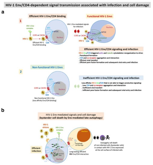 HIV-1 Env-mediated productive cell signals and cell damage: (a) functional HIV-1 Envs of viral isolates from progressors (progressors and RPs) and viremic (VNPs) patients efficiently binds to CD4 for the promotion of the F-actin and MTs reorganizations and post-translational modifications. This signal drives pseudopod formation in CD4+ T cells where CD4 and chemokine co-receptors for HIV-1 infection reorganize, aggregate and interact (step 1) [,,,,,,,]. These events are required for efficient pore fusion formation, viral transfer, virus entry and infection. On the contrary, non-functional HIV-1 Envs of viral isolates from non-progressors’ patients (LTNP-ECs, LTNPs and vLTNPs) are not able to bind to CD4 with high affinity, and thereby are unable to reorganize the cytoskeleton and favour all the events for productive viral transfer and infection (step 2) [,,]; (b) functional HIV-1 Envs of viral isolates from viremic and progressors (VNPs and RPs) patients efficiently bind to CD4 to trigger late autophagy with subsequent cell death of non-infected CD4+ T cells (bystander cells) by contact [].