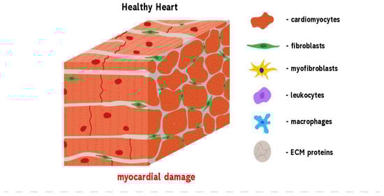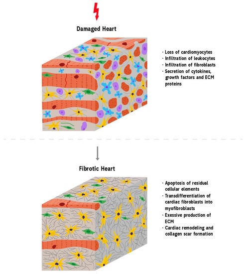 The term “fibrosis” describes the pathological reparative process occurring in all tissues in the body. It is characterized by the excessive deposition and impaired degradation of extracellular matrix (ECM) proteins, leading to tissue thickness and abnormal tissue remodeling [3]. The main outcomes of fibrosis are rapid wound healing and the reduction in adverse immune responses following injury and infection as well as re-epithelialization and the protection of injured tissue from contaminants. However, fast repair results in the loss of proper anatomy and thus proper functions of the tissue [4]. The formed scar area in the heart is not functional, as cells that replace cardiomyocytes lack a contractile function.