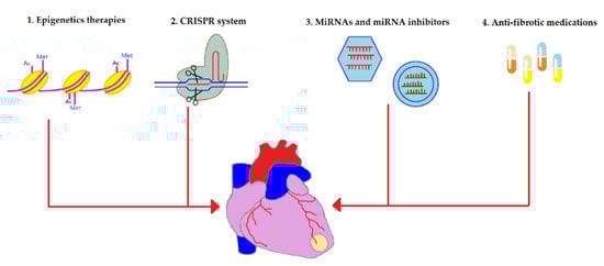 Fibrosis is a pathogenetic process that leads to heart failure and increased morbidity and mortality after MI and other CVD. Unfortunately, there are no approved therapies that would specifically target cardiac fibrosis. Nevertheless, a variety of novel treatments have demonstrated encouraging results in pre-clinical studies. For instance, miRNAs and epigenetic regulators such as HDAC and methyltransferases have been shown to control fibrotic cardiac remodeling and have therefore been tested as potential candidates or targets for anti-fibrosis therapy for a number of heart conditions. CRISPR technology has been utilized to silence fibrosis-related genes as well as to genetically engineer stem cells to enhance their efficiency. Anti-fibrotic medications such as pirfenidone, angiotensin receptor blockers, NLRP3 inflammasome inhibitors, and others have either been approved or are being evaluated in clinical trials for the treatment of fibrosis-related diseases. Although their use to address cardiac fibrosis is still limited, a number of pre-clinical studies have demonstrated compelling evidence of their efficiency.