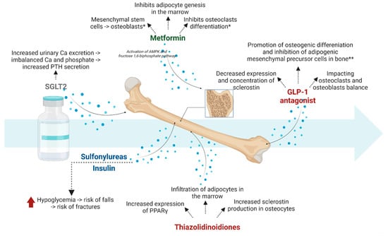 Thiazolidinoidiones decrease BMD and increase the risk of fractures by eliminating the inhibitory impact of PPAR-γ on the differentiation of osteoclasts, increasing sclerostin production in osteocytes, and increasing adipocyte infiltration in the marrow [], which was considered for rosiglitazone and pioglitazone [,]. Rosiglitazone decreased bone regeneration, influenced trabecular bone in the metaphysis of the femur and decreased the density of osteoblasts and osteoclasts []. Additionally, it also affected TRAP-linked epiphyseal growth plate, leading to a decreased bone mass and an increased risk of fractures. The ex vivo study demonstrated that osteogenic involvement had been reduced during treatment with rosiglitazone, leading to an increased expression of PPARγ and decreased Runx2/Cbfa1, inhibiting phosphorylation AMP kinase, and inhibiting osteoblast mineralization and differentiation [].