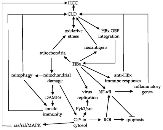 In addition to the oxidative stress triggered by immune responses against virus-infected cells, HBx also stimulates oxidative stress from its association with mitochondria [] (Figure 3). Oxidative stress damages mitochondrial DNA, and subsequent alterations in cellular bioenergetics cause hepatocellular damage and the release of Damage-Associated Molecular Patterns (DAMPs), which promote inflammation associated with CLD (Figure 2). Cytosolic mitochondrial DNA triggers inflammation via recognition by endosomal-associated TLR-9, and by activation of the inflammasome and IFN pathways []. Mitochondria-associated HBx [] causes depolarization of the mitochondrial membrane potential, promotes the redistribution of calcium ion (Ca2+) to the cytosol, and stimulates the generation of reactive oxygen intermediates (ROI), resulting in apoptosis [,]. HBx also strongly activates NF-κB [,], which is hepatoprotective, in part, by being anti-apoptotic []. Thus, many HBx-expressing hepatocytes are protected during bouts of CLD, thereby maintaining cells that support chronic infection. Constitutive activation of NF-κB also results in the upregulated expression of multiple inflammatory genes. The latter promotes a persistent oxidative environment that increases HBx expression and activity, which in turn, stimulates HBV gene expression and replication (Figure 3). HBx activation of phosphoinositol 3-kinase (PI3K) and β-catenin is also hepatoprotective because these block immune mediated cytotoxicity of virus-infected hepatocytes by Fas and by tumor necrosis factor alpha (TNFα) []. Elevation of cytosolic Ca2+ also (i) induces oxidative stress [] that subsequently activates Pyk2 and src kinases which support HBV replication, and (ii) elevates Ras, Raf and Mitogen-Activated Protein Kinase (MAPK) signaling, which contribute to cell growth and hepatocarcinogenesis []. HBx-elevated ROI activate pro-inflammatory signaling through NF-κB, and some of the pro-inflammatory cytokines activate STAT3, which then transcriptionally regulates cell growth and differentiation []. In addition, mitochondria-associated HBx binds to Mitochondrial Antiviral Signaling Protein (MAVS), which is a part of the Retinoic acid-Inducible Gene 1 (RIG-1) pathway that activates type 1 IFN and the expression of other pro-inflammatory genes mediating innate immunity []. In summary, HBx within mitochondria enhances HBV replication, helps to confer resistance of infected cells to apoptosis through hepatoprotection despite activating inflammation, and blunts innate immune responses required for mediating virus clearance. Mitochondria-associated HBx also triggers mitophagy []. Mitophagy could also promote chronic inflammation, continued virus replication, and progression to HCC (Figure 3). These features suggest that blocking HBx activity will impact multiple aspects of the host–virus relationship that are relevant to achieving a functional cure.