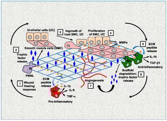 Some reports have indicated that SIS facilitates the M1–M2 transition and promotes wound healing to advance from inflammation to proliferation. Dziki et al. [] investigated the mechanisms of SIS treatment in volumetric muscle loss (VML) injuries. VML is a massive or excessive skeletal muscle injury resulting from trauma, tumor ablation, or degenerative disease. Skeletal muscle can repair in response to mild trauma. However, the skeletal muscle damage associated with VML overwhelms the regenerative process, resulting in scar tissue deposition, loss of function, and esthetic deformities. The therapeutic options for massive loss of skeletal muscle tissue after trauma, surgical excision of neoplasms, and related conditions are limited. Autologous muscle grafts or muscle transposition represent optional salvage procedures for the restoration of muscle tissues; however, these approaches are limited by the availability of donor tissue. Alternatively, cell-based therapies have been explored, but problems still arise in ES/iPS cell therapies, such as immunogenicity, the desirable requirement of the source, and a favorable environment to maintain cell viability []. Furthermore, the development of a therapy that avoids the collection, isolation, and/or ex vivo expansion and purification of autologous stem cells with subsequent reintroduction to the patient would reduce the regulatory hurdles for clinical translation, reduce the cost of treatment, and avoid the risks associated with cell-based approaches. There is an unmet need for therapeutic strategies that can enhance the innate regenerative capacity of skeletal muscle following VML []. Dziki et al. [] analyzed the spatiotemporal patterns of myogenic and neurogenic progenitor cells and the pattern of macrophage activation following SIS in a murine model of VML. The group treated with ECM showed an early transition from predominant M1-like macrophages to robust M2-like macrophages. SIS treatment promoted perivascular stem cell mobilization, increased the presence of neurogenic progenitor cells, and was associated with myotube formation. These cell types were present not only at the periphery of the defect near the uninjured muscle, but also at the center of the SIS-treated defect. Furthermore, SIS altered the wound microenvironment, allowing synergy and crosstalk between key immune regulators and skeletal muscle progenitor cells, whose spatiotemporal distribution is associated with de novo skeletal muscle formation and site-appropriate remodeling. Based on these results [], SIS can induce site-specific remodeling in the organs or tissues where it is placed. Although SIS is a xenogeneic substance, clinical or histological evidence of immediate or delayed rejection has not been reported. Allman et al. [] performed histological analysis to detect rejection or acceptance by determining cytokine levels at the graft site in a mouse model. Ten days after SIS implantation, inflammation was notably reduced and the graft site contained mononuclear cells. The implant was surrounded by increased tissue organization and fibroblastic proliferation, indicating tissue remodeling. On day 28, the inflammatory process resolved, indicating acceptance of the graft. The host response to SIS was like that of syngenetic muscle tissue. The analysis of cytokine RNA from the graft site at the time of mononuclear cell infiltration (seven days after implantation) showed increased levels of IL-4 mRNA, a marker of M2 macrophages, as well as the absence of interferon-γ, a marker of inflammation. The analysis of the antibody isotype also revealed the involvement of the Th2 pathway, which is associated with transplant acceptance.
