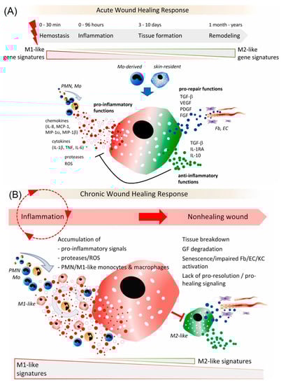 (A) Role of macrophages in an acute wound healing response; (B) Dysregulated activation of macrophages in chronic wounds. Reprinted from Ref. [].