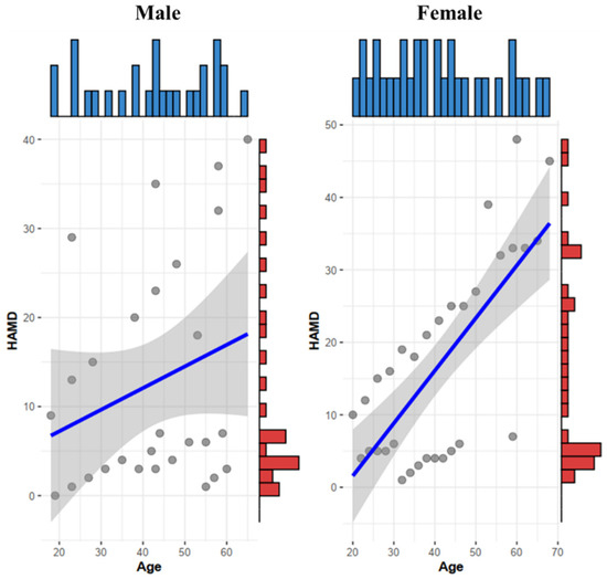 The distribution of HAMD-24 scores in the patient group ranged from 9 to 48 points. A total of 10 patients with a total score of 8–20 points, which was mild depression; 15 patients with a total score of 20–35, which were mild to moderate depression. There were 5 patients with a total score of >35 points, which meant severe depression. The scores of HAMD-24 in the control group were all <8 points, showing a non-normal distribution, and the median (25% and 75%) points were 3 (0, 5). Figure 2 shows the distribution of male and female age and HAMD-24 scores.