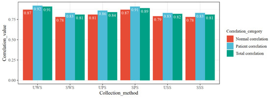 In this section, six methods (UWS, SWS, USS, SSS, UPS, and SPS) were used for the collection of saliva. The correlation between each saliva sample and blood cortisol was analyzed. Figure 4 shows the correlation between the six saliva collection methods and blood cortisol. It can be seen that the saliva cortisol level obtained by the six saliva collection methods has a very strong correlation with blood cortisol. The UWS was the closest to the blood cortisol level (r = 0.91). It can also be found that the cortisol level of the patient group was correlated with the blood cortisol level, which was higher than that of the control group. Moreover, there was no significant correlation between the irritating saliva collection method and the nonirritating collection method.