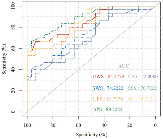 According to the ROC curve, the best cut-off value of SPS cortisol level for diagnosing depression was 15.9 nmol/L, with the highest sensitivity and specificity, which were 66.66% and 96.66%, respectively, and the area under the curve (AUC) = 0.89. Next was blood cortisol, with an AUC of 0.86. UWS ranked third with an AUC of 0.85, as shown in Figure 5. In addition, in our study, we found the increased prevalence of depression was related to saliva cortisol ≥ 15.9 nmol/L, the AUC reached 0.75, and the diagnostic performance was classified as good.