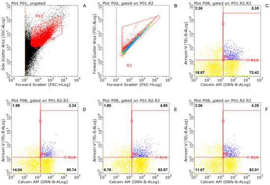 Crude synaptosomes from rat hippocampus were prepared according to the protocol. Consequently, 100 µL aliquots were separated to label the synaptosomes. Viability after 1 h incubation with KLVFF was assessed using a flow cytometer. Double staining allowed differentiation of early apoptosis and viable neuronal particles. Annexin-V (Miltenyi Biotec GmbH, Bergisch Gladbach, Germany; conjugate PE, order n° 130-118-363) has a high specificity and affinity for phosphatidylserine (PS); binding of Annexin-V to the membrane with exposed PS provides a highly sensitive method for detecting early cellular apoptosis [29,30]. Moreover, the viability was described by Calcein-AM (Biotium, Fremont, CA, USA; catalog n° 30026); this acetoxymethyl ester of calcein is a lipid-soluble diester fluorogenic esterase substrate that passively crosses the cell membrane and that is frequently used to stain viable cells. Within cells, it is converted by intracellular esterases into a polar lipid-insoluble fluorescent product (calcein) that is retained by particles with intact membranes but released from damaged neuronal buttons [31]. All assays were performed by Guava® easyCyte™ Luminex Corporation Austin, TX, USA. Before incubation with Annexin-V, the sample was resuspended in 95 μL Annexin-V Binding Buffer. The synaptosome preparation was then enriched with 5 μL of Annexin-V conjugate, incubated for 15 min in the dark at room temperature, and finally washed again with binding buffer. Meanwhile, Calcein-AM working-solution was prepared, final concentration—2 μM (2 mM Calcein-AM stock solution diluted in PBS). An amount of 40 μL of the working solution was added to the sample and incubated at 37 °C for 30 min, then washed with MP. Some samples were labeled with both Annexin-V and Calcein-AM, to describe the ratio between apoptotic and non-apoptotic particles. In the latest phases of setting, Propidium iodide (PI) (Miltenyi Biotec, order n° 130-093-233) was added as a membrane integrity marker. It is excluded from viable vesicles but can penetrate membranes of dead or dying cells.