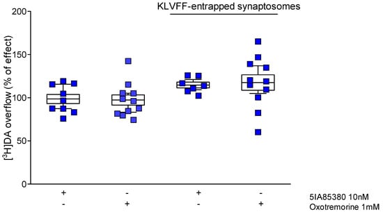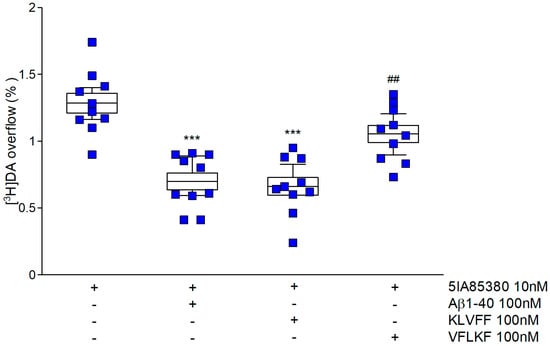 Crude synaptosomes from rat NAc or hippocampus were prepared according to [24]. In release experiments, NAc synaptosomes were incubated for 20 min at 37 °C with [3H] Dopamine ([3H] DA; final concentration 0.03 µM) in the presence of 6-nitroquipazine (final concentration 0.1 µM), to avoid false labeling of serotonergic terminals and desipramine (final concentration 0.1 µM) and mislabeling of noradrenergic terminals. In a series of experiments, hippocampal synaptosomes were incubated with [3H] Noradrenaline ([3H] NA; final concentration 0.03 µM) in the presence of 6-nitroquipazine. Identical portions of the synaptosomal suspension were then layered onto microporous filters at the bottom of parallel superfusion chambers set at 37 °C [25,26]. Synaptosomes were superfused with standard physiological medium at 0.5 mL/min. Starting from t = 36 min to t = 48 min of superfusion, four consecutive 3 min fractions (b1–b4) were collected. Synaptosomes were exposed to agonists or to depolarizing agent (4-aminopyridine) at t = 39 min, until the end of superfusion, while other drugs (antagonists, peptides, antibody, allosteric modulators) were added 8 min before agonists. To introduce a specific amount of KLVFF into synaptosomes, we used an experimental approach previously used [27,28]. When indicated, rat NAc was homogenized in buffered sucrose containing Aβ1-40 (2 µM, 200 nM, 20 nM, and 2 nM) or 6E10 monoclonal antibody (1 mM) in order to entrap these agents into subsequently isolated synaptosomes. Based on estimates made by entrapping of [3H] sucrose, the intrasynaptosomal concentration of the compounds was approximately 5% of the original concentration in the homogenization medium [27]. The collected samples and superfused synaptosomes were then counted for radioactivity (fractional efflux). The agonist-induced effect was expressed as % induced overflow and evaluated by subtracting the level of neurotransmitter released in the four fractions collected under baseline conditions (no added drug) from the level released in the presence of the stimulus.
