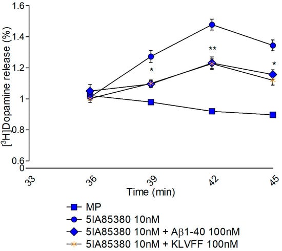 Time course of 5IA85380-induced [3H] dopamine release from striatal synaptosomes in the presence or in the absence of amyloid peptides. The results represent the fractional release obtained in the superfusion protocol. Data are mean ± SEM (n = 6 per group). * p < 0.05 ** p < 0.01 (compared to MP) two-way ANOVA followed by Tukey’s post hoc test.