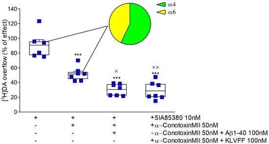 Effect of amyloid peptides on 5IA85380-induced [3H] dopamine release from rat NAc synaptosomes in the presence or in the absence of α-conotoxin MII. Data are mean ± SEM (n = 7 per group). *** p < 0.001 (compared to 5IA85380); × p < 0.05, ×× p < 0.01 (compared to 5IA85380 plus α-conotoxin MII) one-way ANOVA followed by Tukey’s post hoc test.