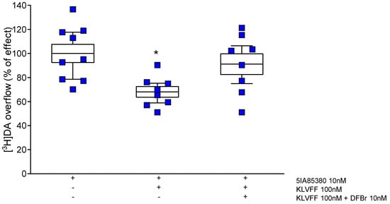 Effect of DFBr on the KLVFF modulation of 5IA85380-induced [3H] dopamine overflow from striatal synaptosomes. Data are mean ± SEM (n = 9 per group). * p < 0.05, (compared to 5IA85380) one-way ANOVA followed by Tukey’s post hoc test.