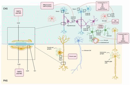 Expression of Cxs and Panxs in the CNS and PNS, and related diseases. In the upper figure the distribution of Cxs and Panxs can be seen along the CNS. Oligodendrocytes communicate with other oligodendrocytes via homotypic gap junctions mainly formed by Cx47/Cx47 and by Cx32/Cx32 [94]. Cx43 and Cx30 are expressed in astrocytes, and they allow the formation of highly interconnected astrocytes that give rise to the astroglial network; they are also expressed in astrocytic endfoot processes that contact cerebral vasculature. Astrocytes communicate with other astrocytes via homotypic gap junctions formed by Cx30/Cx30 or by Cx43/Cx43. With astrogliosis, astrocytes undergo morphological and functional changes that include the increased activation of Cx43 hemichannels involved with the release of neurotoxic compounds. This alteration has been related with AD, PD, ASD, Pain, Epilepsy, and Cerebral Ischemia [123]. Activated microglia have also been related with the release of neurotoxic compounds, and they express Cx36, Cx32, and Panx1 that can be induced by TNF-a and INF-b [105,124]. Inherited diseases have been related to mutations in the Cx genes: ODDD is caused by mutations in GJA1 gene that codes for Cx43 [125] mutations in the GJB1 gene that codes for Cx 32 expressed in Schwann Cells (shown in the lower part of the figure, PNS) and oligodendrocytes results in X-linked Charcot-Marie-Tooth Disease; PMLD is caused by mutations in the GJC2 that codes for Cx47. AD: Alzheimer’s disease, PD: Parkinson’s disease, CMTX: X-linked Charcot-Marie-Tooth disease, MS: multiple sclerosis, PMLD: Pelizaeus–Merzbacher-like disease type 1, ODDD: Oculodentodigital dysplasia, CNS: central nervous system, PNS: peripheral nervous system, ASD: autism spectrum disorder, GJA1: gap junction protein alpha 1, GJB1: gap junction protein beta 1, GJC2: gap junction protein gamma 2. Created with BioRe.nder.com.