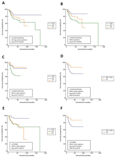 Kaplan–Meier estimations of lung cancer-specific overall survival according to TLR5 genotypes. (A) rs5744174_F616L, all lung cancer patients (n = 415); (B) rs5744174_F616L, only non-small cell lung cancer (NSCLC) patients (n = 343); (C) rs5744174_F616L, only squamous-cell carcinoma (SQC) patients (n = 131); (D) rs5744174_F616L in co-dominant model, only SQC patients (n = 131); (E) rs725084, only adenocarcinomas (AdC) patients (n = 197); and (F) rs725084 in co-dominant model, only SQC patients (n = 131).