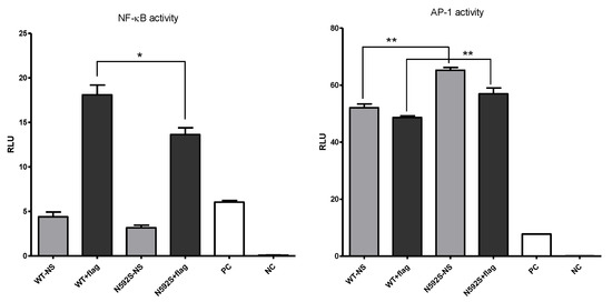 3.3. N592S Variant Affect the Activation of the NF-κB and AP-1 Transcription Factors