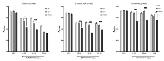 Proliferation analysis of the non-infected (NI) H1299 cells, infected with adenoviral vector carrying wild type of the TLR5WT (WT) or mutated TLR5N592S (N592S) gene. Cells were stimulated with flagelin (50 ng/μL) and increased concentration of different cytostatic, cisplatin (35, 45 and 70 μM), carboplatin (150, 170, and 200 μM) and paclitaxel (2, 2.5, and 4 nM), or left untreated (NON). Statistical analysis was performed by using GraphPad; two-way ANOVA test; ** p < 0.01 and *** p < 0.001.