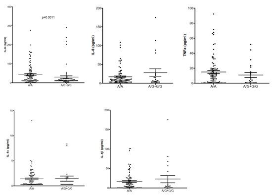 Effect of the TLR5 rs2072493_G/A (N592S) genotypes on serum IL-6, IL-8, TNFα, IL-1α, and IL-1β concentrations. Analysis was performed with a ProcartaPlex High Sensitivity Assay, according to manufactures protocol, which can be found in the Materials and Methods section. Statistical analysis was performed by using GraphPad; non-parametric t-test (Mann–Whitney test). Dots represent A/A genotype, squares represent A/G + G/G genotype.