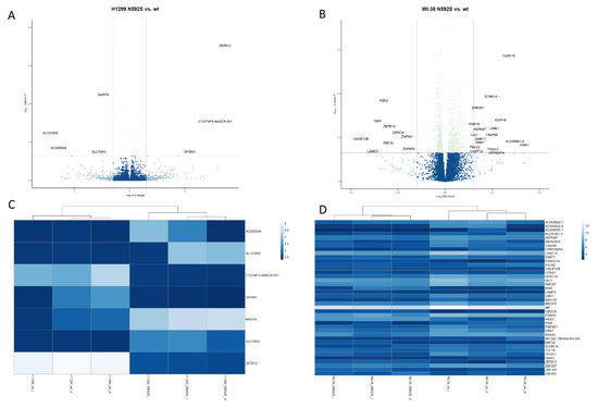 Comprehensive transcriptome analysis of the H1299 and WI-38 cell lines overexpressing TLR5WT or TLR5N592S gene variants. Volcano plot of differentially expressed transcripts in H122 (A) and WI-38 (B) cell line. Heat map describing expression of statistically significant DEGs with dendograms indicating hierarchical clustering between H1299 (C) and WI-38 (D) cell lines.